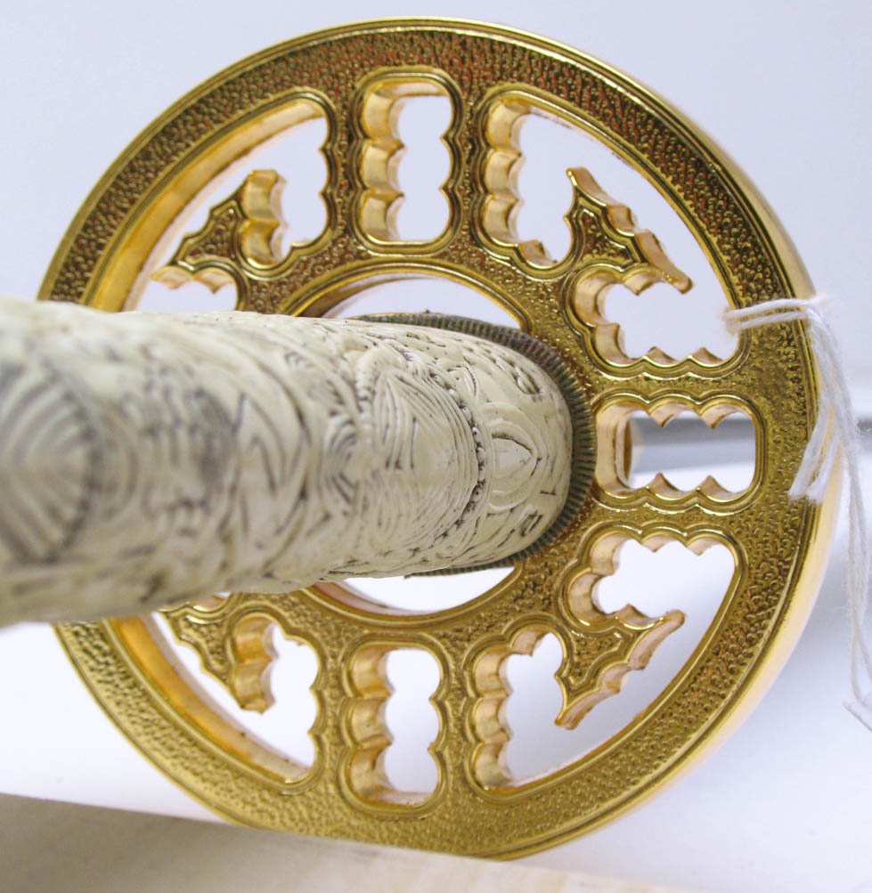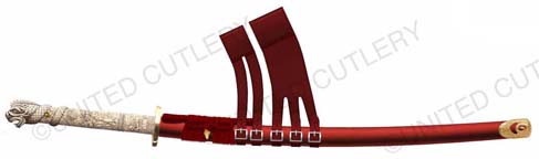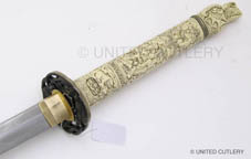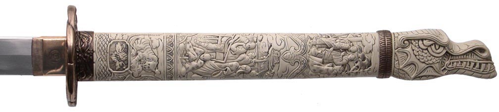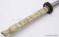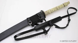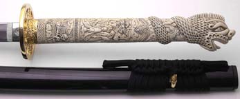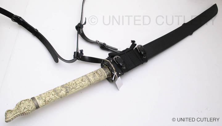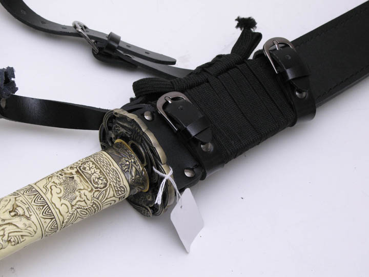For the Duncan katana, UC wanted basically a straight copy of the Spanish made sword (shown above), which is what was used in the tv show after season 1. I prefer the season 1 sword, but it was decided to continue with the more popular of the two Duncan katanas. Hopefully at some point in the future the season 1 version will be made. UC's will not have a mold line on the hilt, nor any big manufacturer logo in the habaki (blade fitting). The blade collar will be solid brass this time, not cast zinc and plated like the Spanish version, and I wanted the fuchi (metal collar at dragon's neck) made the same color as the ivory grip (more about that below). The Duncan scabbard, which was rarely seen being worn in the show, will not be a traditional wood scabbard, but a flat leather scabbard with a sort of shoulder harness rig. Imagine what you think Duncan's scabbard would have looked like under his overcoat. That is what this is. A slim leather scabbard on a tight fitting harness that could be concealed under an overcoat.
