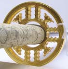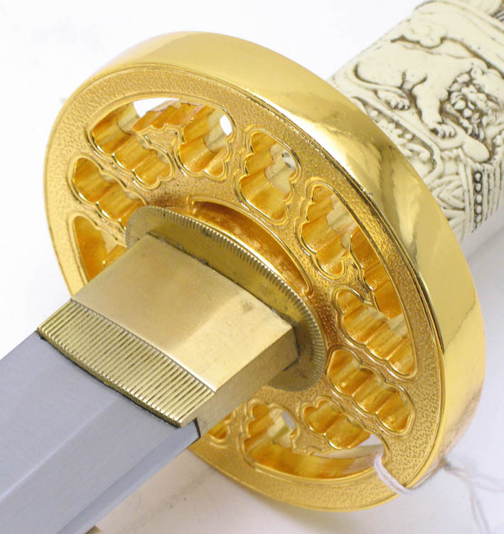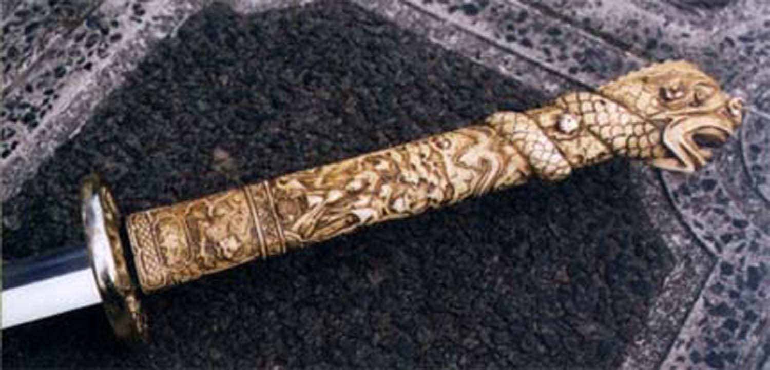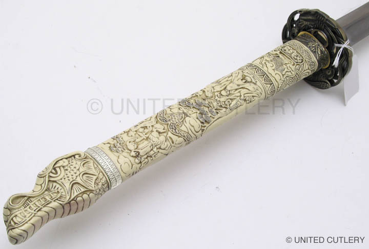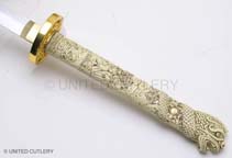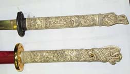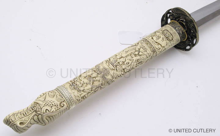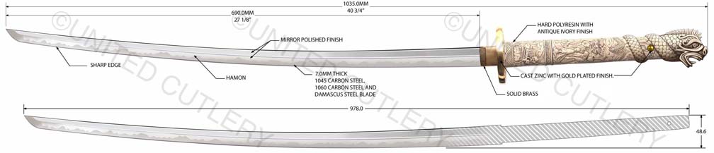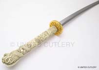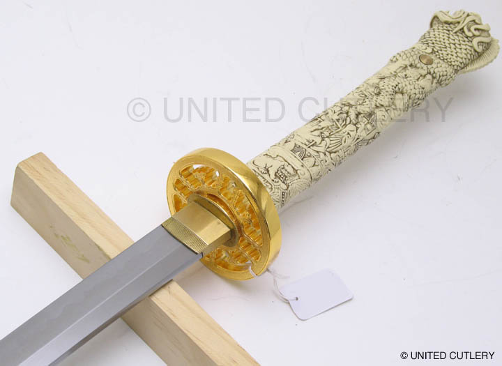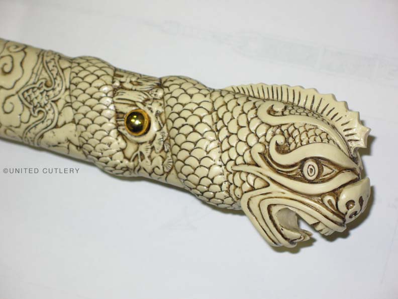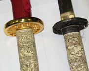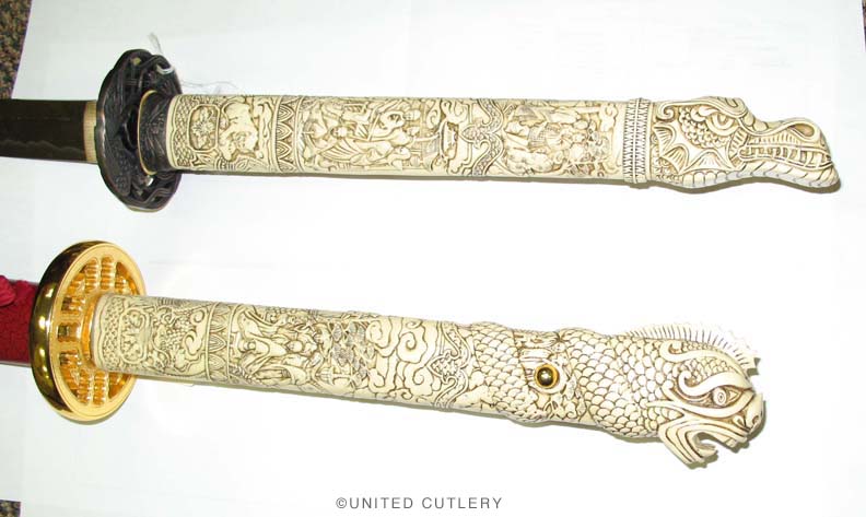 Photos (above) of the second prototypes of each sword, likely the final versions UC will make - 2009. The handle grips are much cleaner, more detailed, and the color is the final antique ivory hue. The Connor tsuba and tang pin covers are corrected, but the Duncan tsuba and fuchi are too dark. Notice the fuchi (metal collar at dragon's neck) on the Duncan sword is the same color as the ivory grip. In most of the Highlander tv shows, up until season 5, it appeared this way, even though the actual Marto swords had a bronze color. We made one up this way in an attempt to be more screen accurate. It was decided to go back to the bronze look like the old Spanish made replica however, as UC's team agreed that it simply looked better. Hopefully UC's factory will make the productions swords even better looking than the final samples! Thanks to John and Dom for prop pix and input, David Stokes for your Highlander knowledge and input, and Carl for sample critiques. |