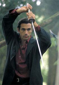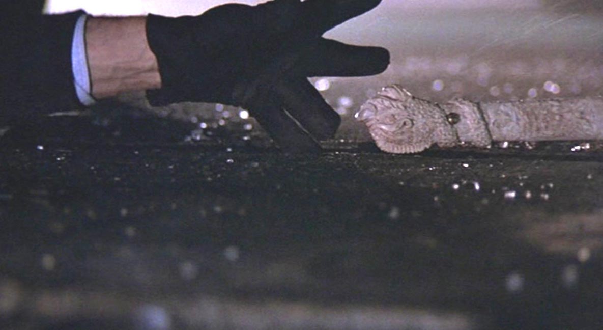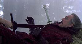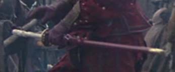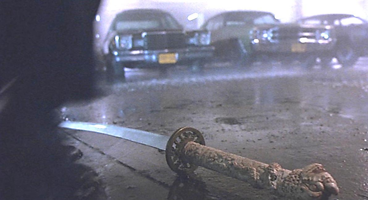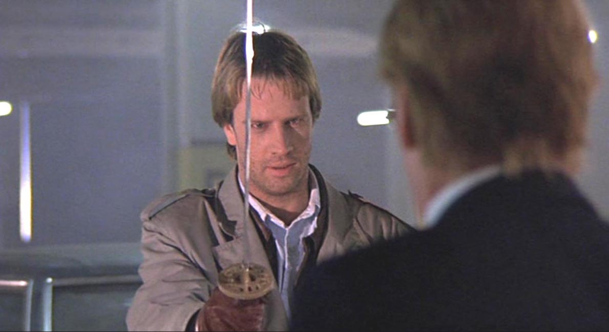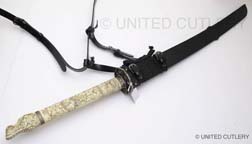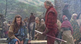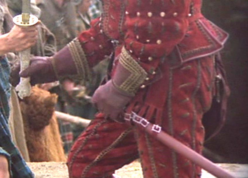 HIGHLANDER SAMURAI SWORDS - Duncan Macleod and Connor Macleod katanas for the Highlander Hand-Forged Series (2009) These are swords for United Cutlery's Highlander line. UC was asked to make new versions of these iconic swords in early 2008 by Peter Davis, who owns the Highlander property and the Legendary Heroes/Highlander store. KRDS was hired to do some of the design work and control drawings for United. The previous versions had been made in Spain with stainless steel blades. Being a fan of the original films, I went back and made notes of things I did not like about previous versions of these swords, and things I wanted to change. There were many details that always bugged me - the primary ones being the plastic grips with injection mold lines, the stainless steel blades, and the big manufacturer logo on the habaki. I always wanted to see a forged carbon steel Highlander sword and something that resembled real ivory for the handle material, and a scabbard that would make that Duncan sword appear out of nowhere like it did on the tv show. As is always the case, time constraints did not allow everything I wanted to accomplish but overall I am satisfied with the results based on the prototypes I have seen from United. Highlander film snapshots of the Connor/Ramirez sword (©MGM)