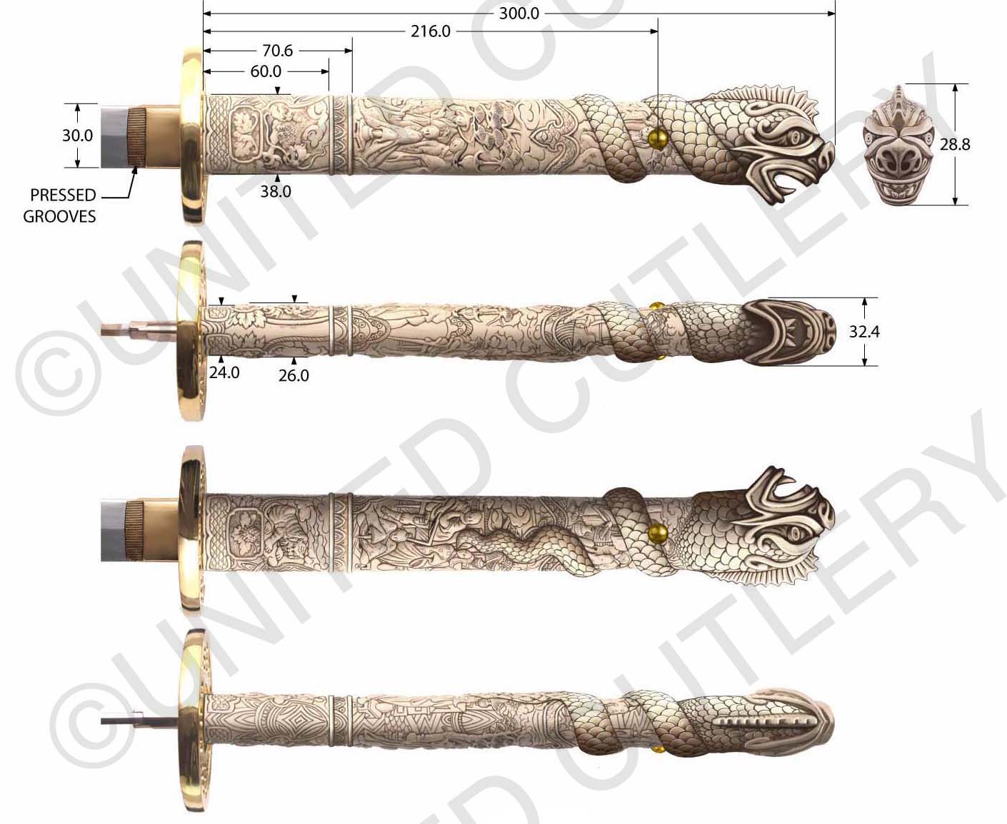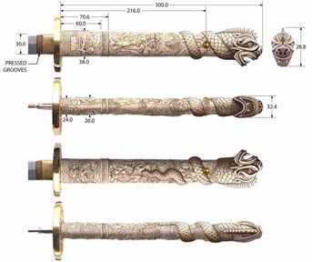 The Highlander 2 version (H2 prop shown above) is my favorite of the three versions, and the preferred look from UC's team. The new Connor/Ramirez sword will be a mix of the Highlander 1 and 2 swords, but based more on H2. Technically this this is more of a new version, not a replica. Some of the control drawings, shown above. A few elements from film 1 are mixed in, such as the tang pin. The hilt length is from the film 2 sword and the the tsuba has been thickened to match the H1 and H2 tsuba. The nose is more bat like than the bulbous Chinese-looking dragon nose of the film handles. The antique ivory "staining" should look better than the plastic grip versions if it comes out right. The red scabbard from film 1 will be replicated for this version, with the red leather hangars like Sean Connery wore in the village scene. A different scabbard, in black, was also used in the scenes in Connor's home from film 1, but we preferred the red one. |