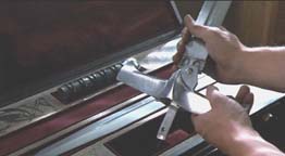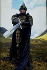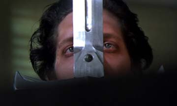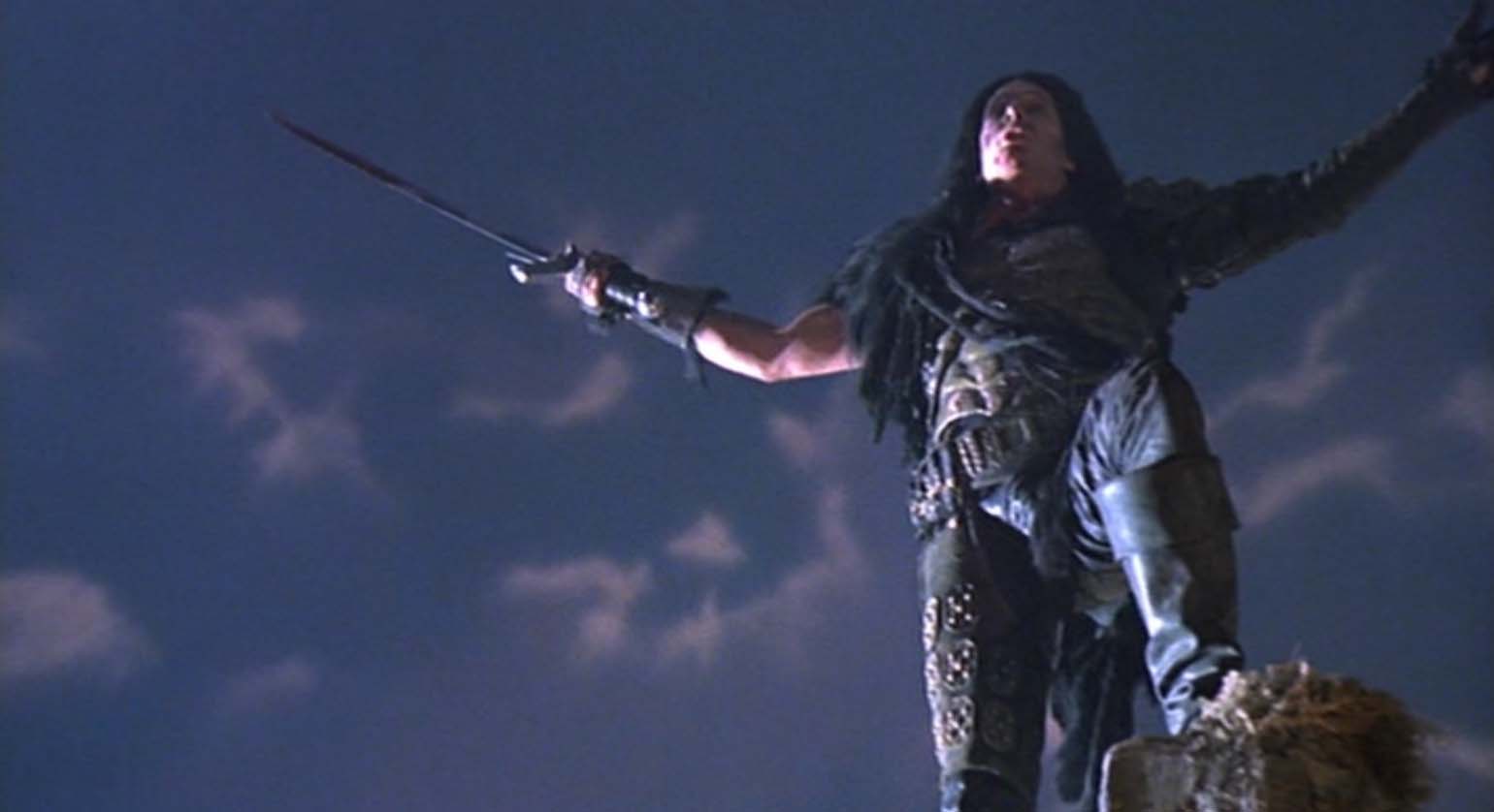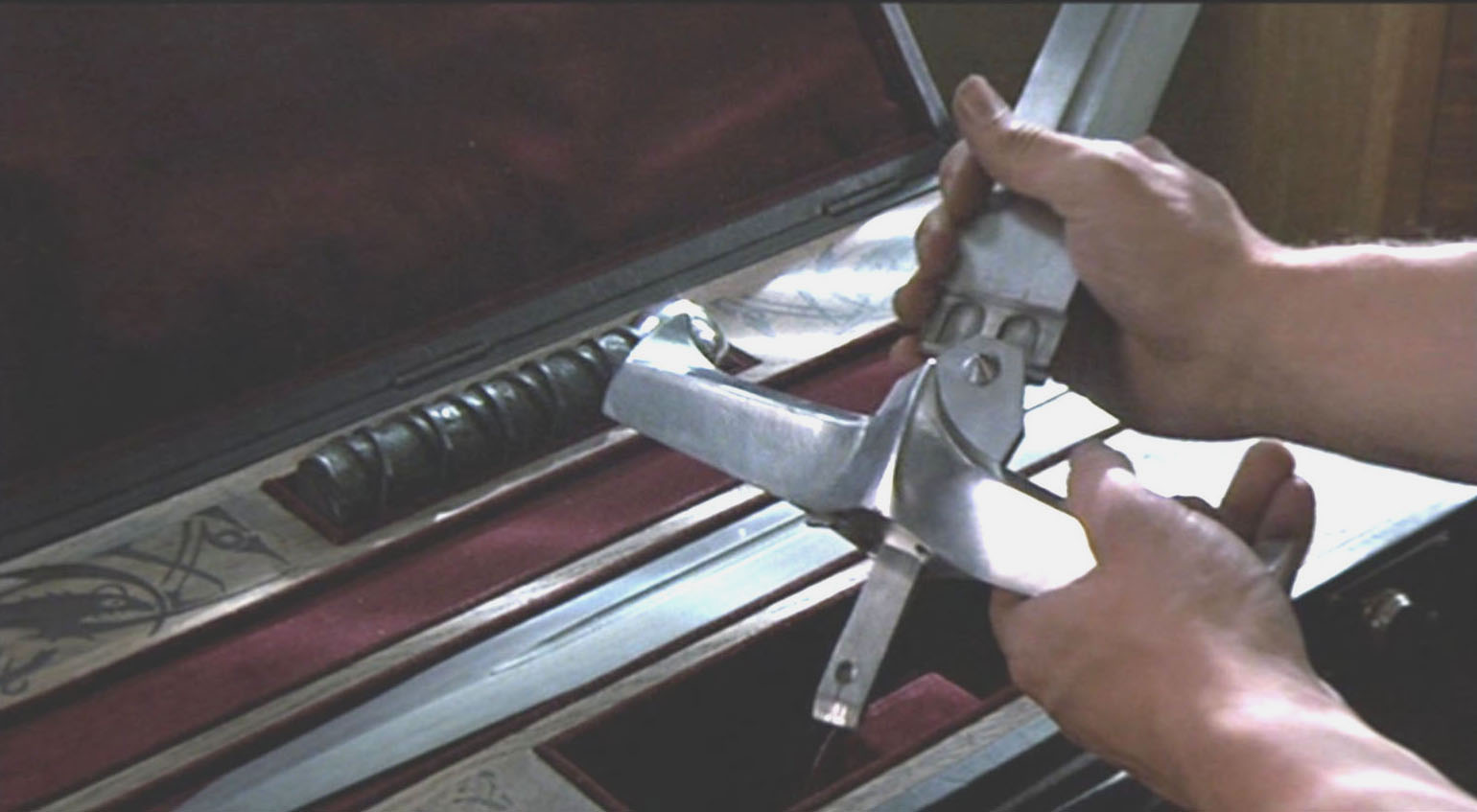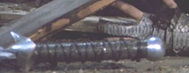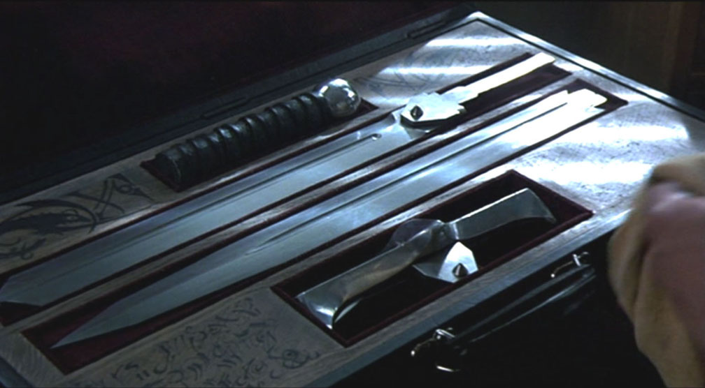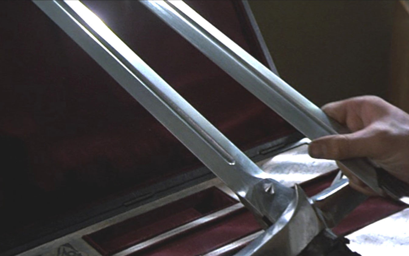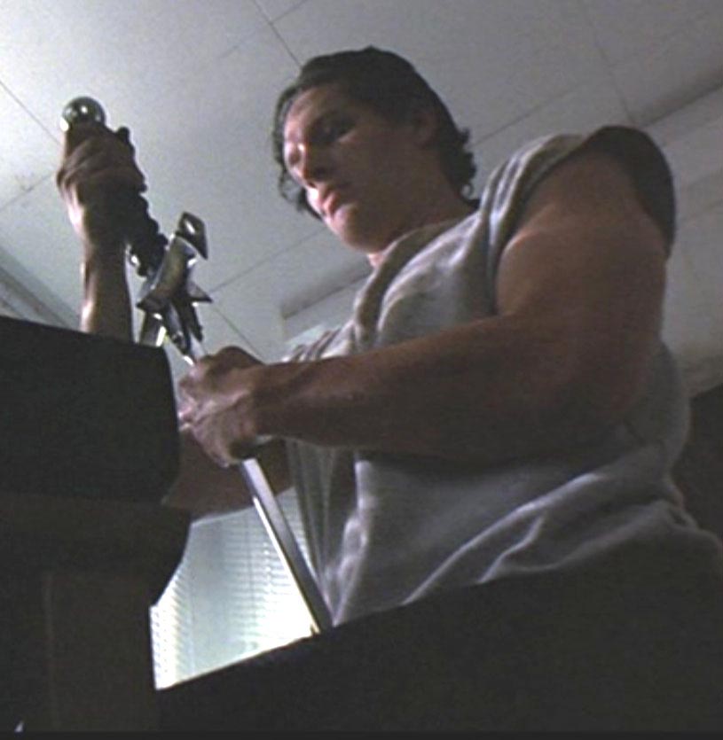 The version of the sword from the apartment scene above is what was used for the United Cutlery replica. The sword is most visible in this scene where it is assembled by actor Clancy Brown. Note the small side blades pop out of the guard in the film. Due to cost restrictions to meet the target price point, and the type of mechanism used, we did not have space for that, so the UC version will have the blades exposed like the Spanish replica version, though they will move into "open" position via a button-gear mechanism. Highlander film photos and screen grabs (©MGM)