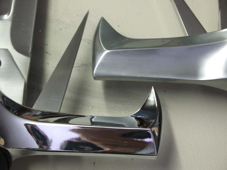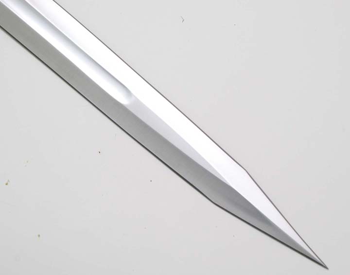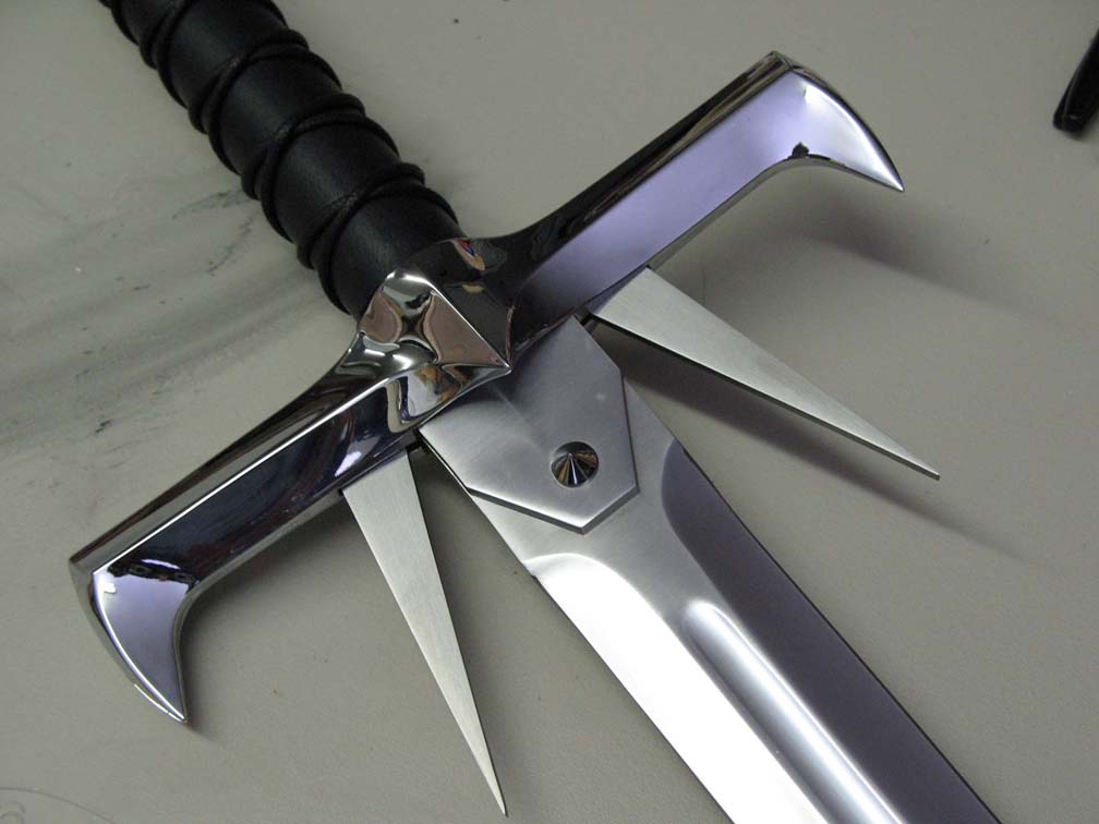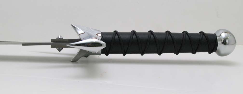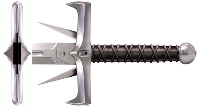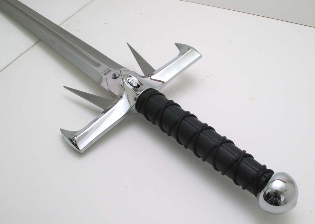 HIGHLANDER KURGAN SWORD (2009)- A new, more accurate replica of the sword used by the Kurgan in the first Highlander film. This was a replica for United Cutlery's Highlander line. UC was asked to make new versions of these iconic swords by Peter Davis, who owns the Highlander property and the Legendary Heroes/Highlander store. We supervised these new replicas for them. The previous version had been made in Spain. Not a bad replica. Many details did not match the film swords, and overall it felt heavy and clunky, partly due to the fact that this is a heavy, clunky design. It sure looked cool in the film when I saw it as a kid though! There were at least three versions of the sword used in the film, possibly four, each with varying shapes, sizes, and details. The United version was to be a mix of some of these, representing what people "remember" seeing rather than a specific screen accurate replica of one particular version, and very different from the Spanish replica. Blade tips and lengths, handle grips wraps and lengths, tang cover shapes, and side blade sizes and shapes all varied from prop to prop. It was decided that the "suitcase" version seen in Kurgan's apartment was the best one to go by since there were many closeups of that version in the film. My list of things to improve included: correcting the blade fuller and grind shapes, especially at the tang and blade tip, increasing the length of the side blades and reducing the open width of the side blades when open to match the film sword seen in Kurgan's apartment, revising and reducing the "fatness" of the hand guard at United's request, enlarging the grip diameter, improving the grip wrapping, and revising the pommel shape. United also wanted to add a mechanism that opened the side blades at the push of a button and have a more polished hand guard and pommel finish than the Spanish made replica. I would have much preferred a simple spring opening mechanism for the side blades as seen in the film, which would not have intruded on the guard design much, but then the sword would have fallen under our ridiculous switchblades laws of the US and other countries. It was decided to use a gear mechanism instead. Even though this is not a functional sword design I wanted it fitted with a carbon steel blade. However, to meet the target price point, and due to the fact that this sword has a highly mirror polished blade which is more succeptible to showing tarnish if the blade is not properly cared for, UC decided to use stainless steel for the replica blade. The photos above show the blunt tipped version of the sword from early in the film. Note that the side blades are opened wider, and slightly shorter than they appear later in the film.