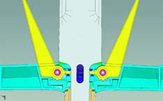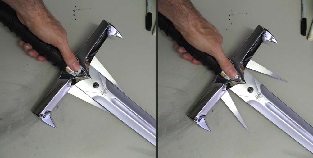 Since a spring loaded opening mechanism would be fall under the ridiculous switchblade laws of the United States and some other countries I had to design a simple gear mechanism to open the side blades via a sliding button on the back of the cross guard. I had done something similar several years ago for United Cutlery's Klingon knife replica, the Phoenix (aka Bird of Prey). I used basically the same design here.