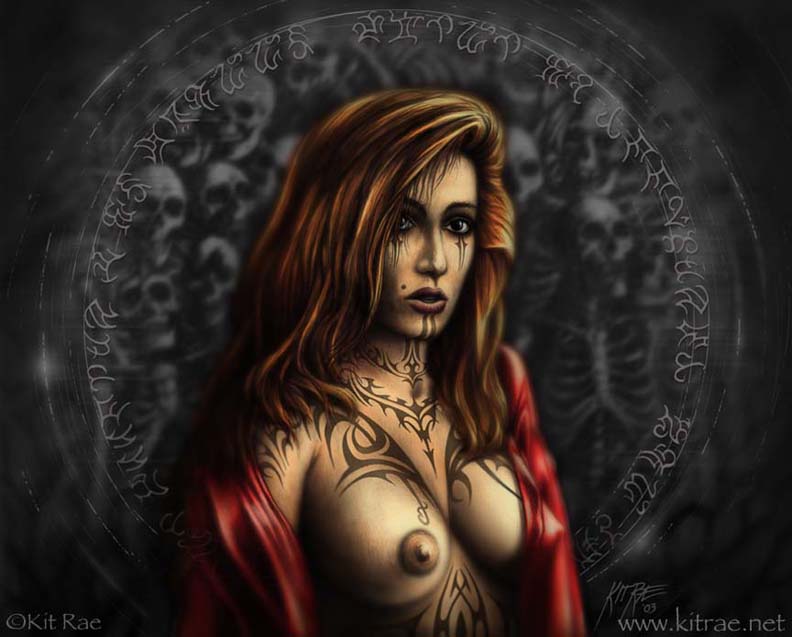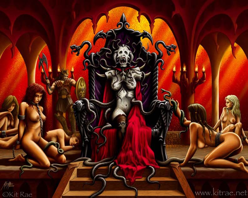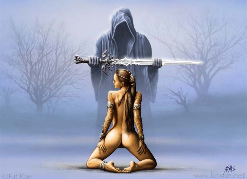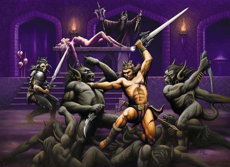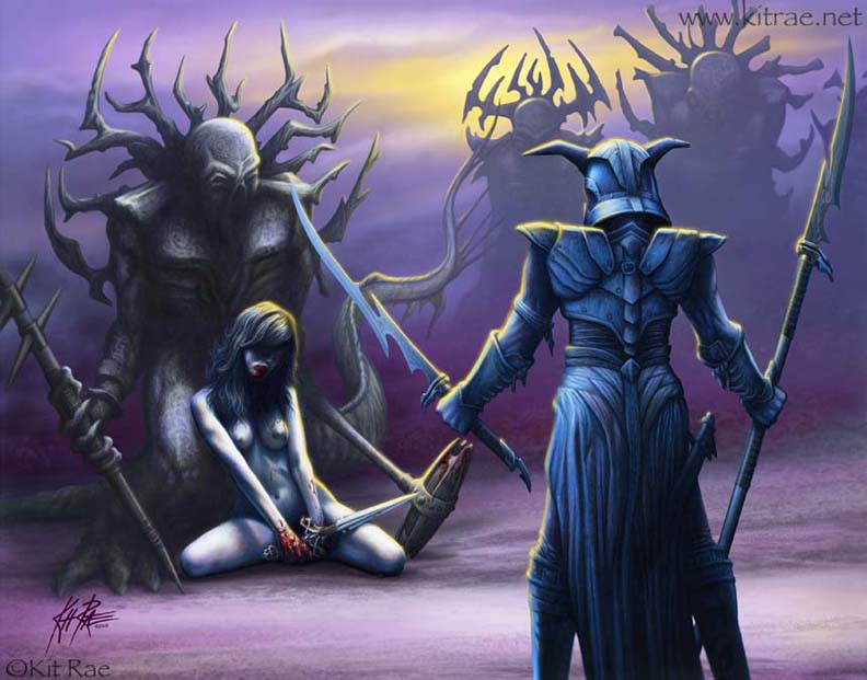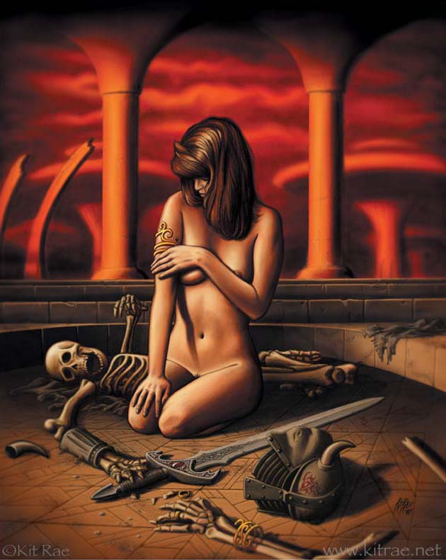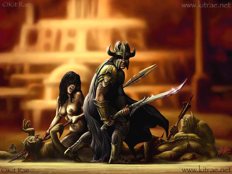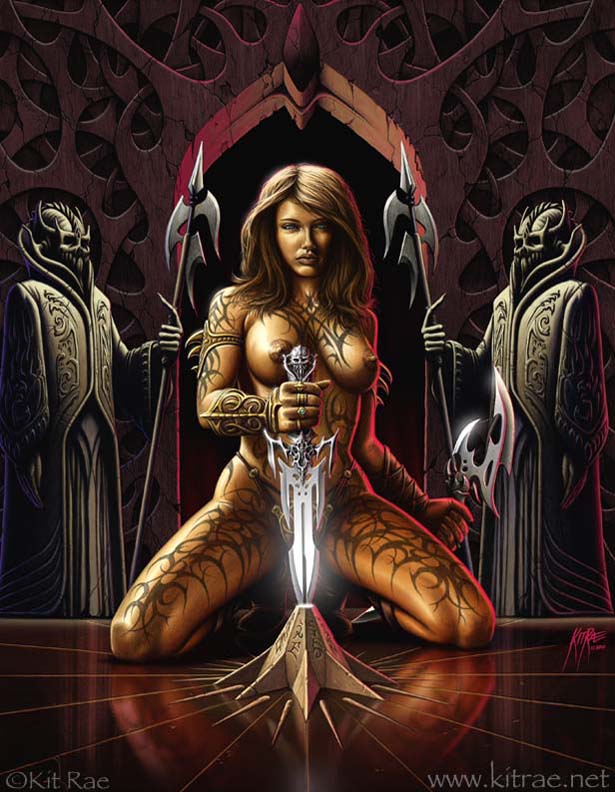 SWORDS OF THE ANCIENTS PAINTINGS This is a collection of paintings relating to the Swords of the Ancients mythology. Many of these original paintings were released as poster versions included with Kit's swords. Click on an image to see a larger version. Do not use or link to any of the artwork on this website without written permission from the artist.The Swords of the Ancients is a tale told in story, art, and steel. Immerse yourself in the 10,000 year mythology about the creation of Ammon, the Ancient Ones, the Blades of Power, and the various characters who encountered them in this massive tale of gods and mortals. The full tale can be read here. Click Here for Black & White Drawings