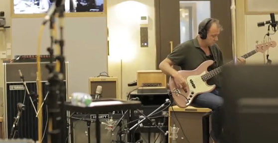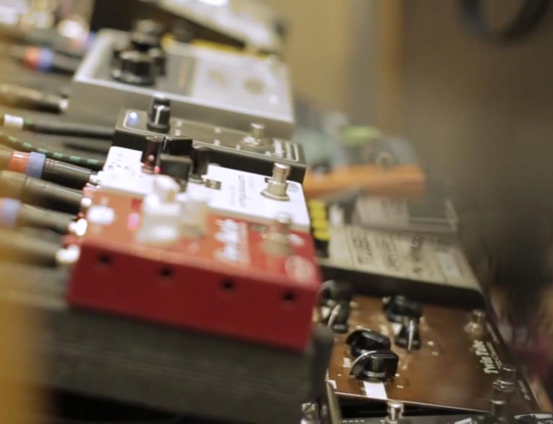 These sessions were the last time the Black Strat and Red Strat were used for studio recording. Those, and many other guitars seen in these studio photos, were auctioned for charty in 2019. David Gilmour recording in 2014 and 2015 in his Medina recording studio live room Gilmour playing his 1958 Gretsch Duo Jet and a custom Fender baritone Telecaster with Bigsby tremolo on TER. Gilmour playing his 1956 Gibson Les Paul with Bigsby and '55 Workmate Esquire for the RTL recording sessions in Medina 2015 Gilmour playing his Black Strat and a 1945 Martin D-18 acoustic for the RTL recording sessions in Medina 2015 The Pete Cornish Mk II pedal board used for David's 2006 tour, now in David's Medina studio. Several changes have been made to the board Gilmour's massive Medina live room pedalboard with an ever-changing line up of effects. The pedals on this version of the board were: Top Row - Effectrode Fire Bottle booster, Effectrode PC-2A compressor, Origin Effects Cali 76-TC compressor, custom floor switchers for the pedalboard effects in the live room Gilmour's vintage Binson Echorec, TC Electronic D-Two - Multitap Rhythm Delay, and Alesis Quadraverb Gilmour's 1980s era BK Butler/Chandler Tube Drivers that were used in his 1994 Pink floyd tour rig, and David's WH-1 Whammy pedal that was used on TER Origin Effects Cali 76-TC compressor, Effectorde Helios vaccuum tube fuzz, and a 1980s era BK Butler/Chandler Tube Driver. Various pedals on David's Medina pedalboard, including an Effectrode Fire Bottle booster, Effectrode PC-2A compressor, and Demeter Compulator (left) Gilmour's vintage Electric Mistress and Boss FA-1 used to EQ and correct the volume drop Some of Gilmour's Medina live room amplifiers (left photo) - Fender Tweed Twin-Amp, Yamaha RA-200 with Alembic F2-B Gilmour's Fender Tremoluxe in the control room