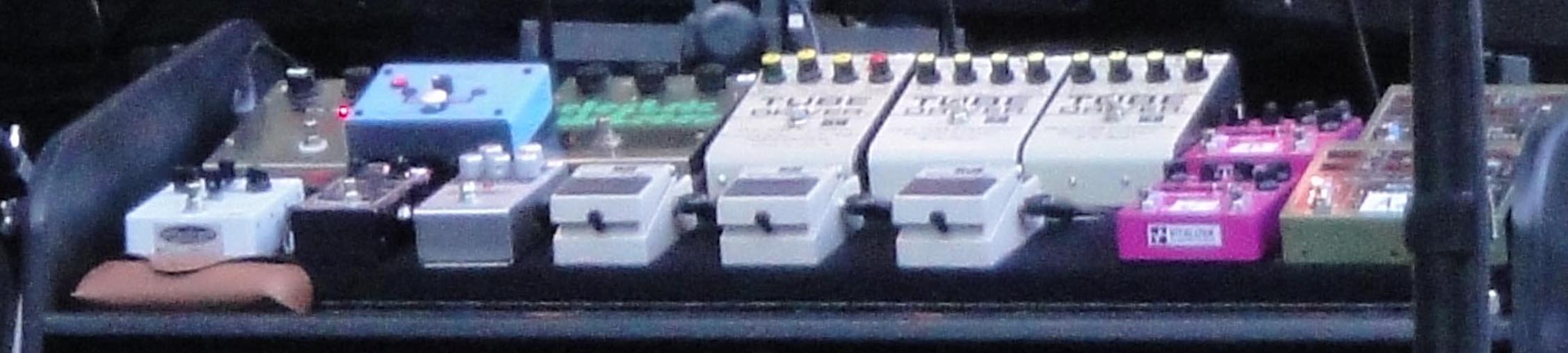 David's forty-one year old 1974 Ram's Head Big Muff and an original green Electric Mistress flanger, connected to a Lehle parallel mixer.