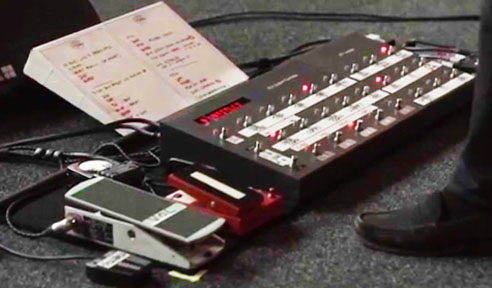 A diagram of Gilmour's SC-1 foot switcher from the South American leg of the 2015 tour Gilmour's modified Ernie Ball VP Jr Volume Pedal, Digitech Whammy WH-1, and Skrydstrup SC1 programmable switching system Gilmour's rack effects from the South American leg of the tour in 2015