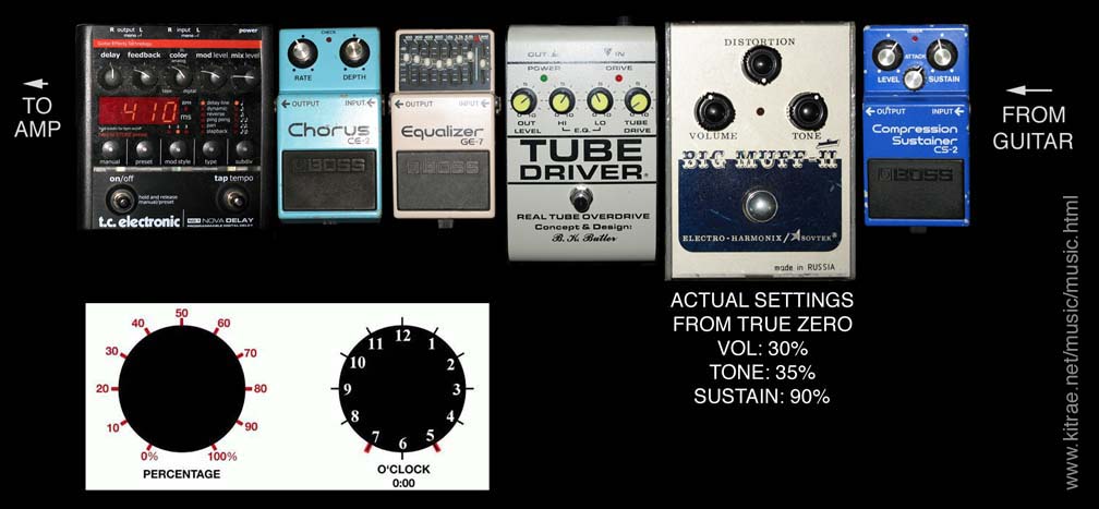 ON THE TURNING AWAY SOLO / PINK FLOYD - Here is my gear and attempts at this amazing David Gilmour solo tone. The original song is a classic and the solo ranks up there with David's Comfortably Numb outro solo. From all accounts, Gilmour likely used a blended distortion-overdive for the solos on Pink Floyd's Momentary Lapse of Reason studio recording. The Boss HM-2 was sent into the Gallien-Krueger 250ML, which was set with a slightly dirty overdive. David used the HM-2 and a Ram's Head Big Muff for the live 1987 tour, and switched the Big Muff for a Cornish P-2 for the 1988 and 1990 tour dates, captured on the Delicate Sound of Thunder album. For the later 1994 Pulse tour David switched to a Sovtek Civil War Big Muff for this song. For my rig I was going for more of the Momentary Lapse of Reason / Delicate Sound of Thunder live tone. Any decent Big Muff type pedal with a deep bottom end and brighter mid range, such as a 1990s Sovtek Big Muff, will work. The old Red Army Overdrive, Civil War Big Muff, green Sovtek Big Muff, or the later Black Sovtek, Bass Big Muff, or Deluxe Bass Big Muff are all perfect for that tone. A good Big Muff clone like the DG-1 Drivegate from TopTone, Stomp Under Foot CWM, or Pete Cornish P-2 are good choices as well. I have a section on all of the Big Muffs HERE. I also have a detailed section on getting this particular tone HERE. A Boss chorus like the old CE-2, CE-3, or later CE-5 is needed for the smooth modulation you hear, and these units work perfectly with vintage Big Muffs, enhancing their tonal characteristics. Some compression and/or a booster pedal to add some gain is also a good idea to achieve this tone if you are using a Sovtek Big Muff, and a slight mids boost, from an EQ to simulate the tone circuit of David's EMG pickups helps. For delay, I use a TC Electonic Nova delay with a warm analog setting, about 3-4 repeats, at 410ms to 440ms. Any good, warm sounding digital or analog delay will work. Some good ones are the old Boss DD-2, DD-3, DD-20, Ibanez DE-7, and the TC Electonic Nova delay. All are good, warm sounding digital delays, with the old DD-2 being my favorite. The Electro-Harmonix Deluxe Memory Man and MXR Carbon Copy delays are two other good analog delays that have a warm tape delay sound. I used a 2008 American Standard Strat with Seymour Duncan SSL-5 bridge pickup into a clean '65 Fender Twin Reverb re-issue. The backing track is from Gilmourish.com, but I have extended it a bit to make a longer solo. My GE-7 is set for a mid range cut here, as it works better for my rig, but you may want to try setting the sliders the exact opposite of this for your rig. On the Turning Away Solo - MXR Dynacomp > Skreddy Pink Flesh > Boss CE-5 > TC Electonic Nova delay (The audio quality is kind of crappy in this clip, recorded with a camcorder) Another easy way to get the DSOT live lead solo tones is to use the Boss HM-2 as a driver into a Ram's Head Big Muff, through a Fender Twin Reverb. The HM-2 is an excellent booster into a Big Muff for DSOT tones, and this combo is a true blend of the characteristics of both pedals. Set the HM-2 as shown in the photo below. The HM-2 is the driver and the muff is the EQ in this combo, so the muff sustain needs to be set very low, around 9:00. The muff tone circuit is interactive with the sustain, so as you turn the sustain down, turn the tone up the same amount (treble side). I keep mine about 3:00, but adjust until it sounds right on your amp. Having a compressor on the front end helps, but you don't really need the EQ pedal unless you think you need a slight mids boost. I use the Boss CE-2 or Boss CE-5 for the lush chorus effect, in place of the SPX-90 II that David used. One drawback to this combo is that it only sounds like DSOT when running it into a clean, mid scooped Fender amp, like the Fender Twin Reverb. It does not sound as good into amps with more mid range, like the Hiwatt DR103 or Reeves. THE STUDIO RECORDED SOLO - To match the studio recorded guitar solo tone from Momentary Lapse of Reason, I use my Strat equipped with EMG-SA pickups (SPC:6, EXG:1), into a Boss CS-2 Compressor, the old Boss HM-2, a BK Butler Tube Driver set for a very light drive boost, delay, and a Boss CE-2 chorus (in that order). I use a gentle curve of the sliders on the GE-7, starting at zero on the ends, and curving up to just past the first notch in the middle. What David actually used in the studio is a bit more complicated, but the basic setup for most of the guitar solos on the album seems to be a two-amp setup, with two separate distortion tones, mixed together for the final sound. David has done this type of thing going all the way back to Pink Floyd's Animals album. GUITAR - The guitar used was either David's '57 reissue Fender Strat or his Steinberger GL3T, both equipped with EMG-SA active pickups. David used the SPC control of the EMG pickups to boost the low mid range. He often set this around 5 when playing live, and it seems the EXG control was always set to 1 and not used. SIGNAL CHAIN, EFFECTS AND AMPS - The guitar signal goes to a stereo volume pedal, where it splits into two separate signal chains, going to two different amplifiers. One side goes to a Gallien Kreuger 250ML amp, using the distortion channel (and probably the built in chorus), and a delay (probably the MXR). The other side goes into a Boss CS-2 compressor, Boss HM-2 distortion pedal, Boss GE-7 equalizer (most likely set for a mid range boost), a Boss DD-2 delay, a Boss CE-2 chorus, into a clean Fender Super Champ amp. Those two amplifiers were mic'd separately, then blended together to make the final mix. I believe this setup, or something similar, was used for just about every guitar solo on a Momentary Lapse of Reason. A Big Muff may have been used instead of the HM-2 for the guitar solo in Sorrow. This type of setup is also similar to what David had been using just prior to A Momentary Lapse of Reason. There are various accounts of what Da