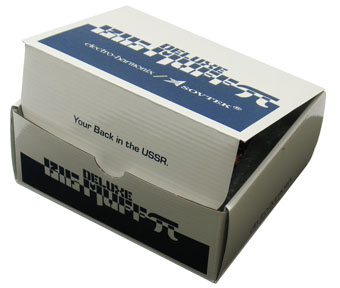 DIFFERENCES BETWEEN THE SOVTEK DELUXE BMP AND THE STANDARD DELUXE BMP - The Deluxe Big Muff PI includes a Bass Boost switch and Attack control not found on the Sovtek Deluxe. The Sovtek Deluxe includes a Tone Wicker switch and Blend control not found on the standard Deluxe. The other primary difference is the sound of the core circuit. Since the Sovtek Deluce is based on the mid 1990s Russian circuit it has slightly more mid range and low end, and slightly less gain than the standard Deluxe, giving it a smoother sound. The standard Deluxe core circuit is based around the nano Big Muff circuit. You can set the controls to get similar tones on each, but you can also get tones on one that you cannot get on the other. PACKAGING - 2-color corrugated cardboard box. "Your Back in the USSR" is printed on the inside box lid flap, a reference to the Beatles' song title. "Your" is not a typo error, it is intentional. THE SOUND - See the section on the Green Russian Big Muff reissue for a description of the core sound. Like the Deluxe Big Muff, this is a veritable fuzz lab, but I like this Green Russian "Tall Font/Civil War" circuit as a platform for the base tone better than the one in the DBM. The number of knobs and switches may seem daunting to the non knob-fiddler musicians out there, but the Deluxe is really just a two-tone distortion that allows you to switch between the base Green Russian sound and a custom EQ'd sound. Once you find a favorite mids setting you like, you simply leave it and switch on or off when needed. When the mids stage is engaged there is a big volume increase, but it can be set to unity volume with the internal trim pot. The Wicker is the same feature from the Tone Wicker Big Muff. It's like a top end boost. It basically lifts some of the top end roll off capacitors out of the circuit to add a bit more highs and bite. When engaged, highs and treble are retained when you dial the guitar volume down. That's something that was never really possible with a standard Big Muff. Switching the Wicker on with the sustain set high really high adds a lot of high gain hiss noise to the sound in between notes when not playing. That's where the noise Gate control comes in. The Wicker is usually used for high gain leads or heavy power chords, but it has other uses on this pedal. The Wicker switch and Blend knob together are the two controls I found really interesting here, and I wish those were both footswitchable as a pair like the mids section. When the Wicker is on you can mix in some of the clean signal with the Blend knob, while retaining the high frequencies that get lost when the distortion is dialed down on a standard Big Muff. This opens up a wide range of possible rhythm and overdrive sounds. Add the switchable mids stage on top of that and there is a huge range of mid ro low gain tones available. The Gate control is the same as the one on the standard Deluxe Big Muff. It's a basic gate circuit that kills the signal when it decays to a certain level. When it engages, the volume does not ramp down, it just stops. If you play something where the notes or chords are required to completely trail off and naturally decay, it may be tricky to use this. Also, at medium to low gain the Gate makes a slightly audible pop sound when you start playing. It's really more for high gain settings. Like the standard Deluxe Big Muff, this one has a jack to connect an expression pedal. This allows you to control the Mids Freq knob with a foot pedal. Depending on where you set the knob, you can do comb filter effects like a traditional wah wah pedal, or more subtle or radical tone changes to accent notes or chords. It has a much wider range of tones than a traditional wah pedal. You can even set it to set it to scoop the mids, something a traditional wah cannot do. The High/Low Q switch also affects the frequencies the filter sweeps. Overall, this is a very versatile pedal, and like the standard Deluxe Big Muff, there are a lot of interesting new tones to explore. For the "set it and leave it" crowd, or those of you that want the Russian Big Muff sound but could not make the standard Green Russian work with your mid-scooped amp, this is the perfect solution. With the tone shaping controls on the Deluxe you can make it sound great on just about any amp. Shown above - 2018 Sovtek Deluxe Big Muff Pi Prototype Shown above - The Deluxe Big Muff Pi Circuit Shown above - The Sovtek Deluxe Big Muff Pi packaging