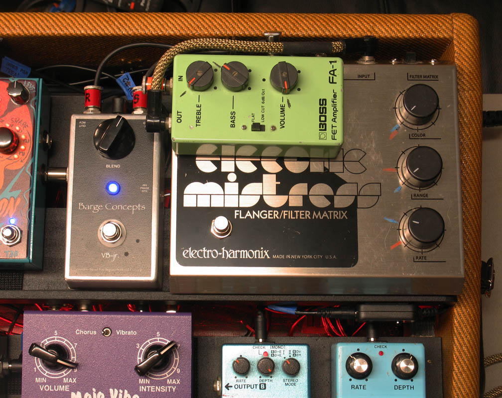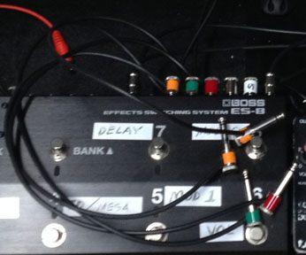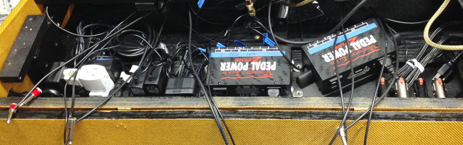 July 29th, 2018 - After a few days of testing and programming effects loops in the Boss ES-8 I made some changes to the signal chain and swapped out a few effects for others that worked better. I also fixed a few bad patch cables and made some power supply changes to a few effects that were not behaving well with the Voodoo Labs. Having the shelves tilt back made accessing the cables and changing out pedals easy!