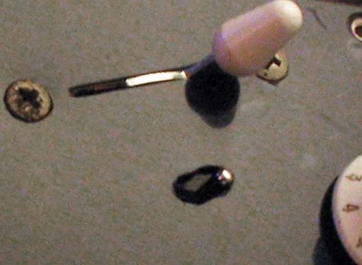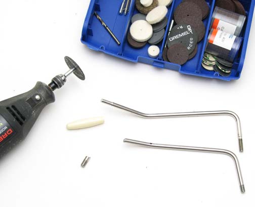 Unscrew the plastic trem tip from the bar and mark your distance, adding to what you measured to compensate for the added plastic tip length. Lock the arm in a vice but be sure to wrap the arm in a piece of leather, rubber, or rag so the vice does not scratch it. You can cut it with a steel saw, or use a Dremel tool or similar hand held device (wear eye protection!). I used a steel disk cutter with a Dremel tool. I also ground the sharp edges down after the cut with a sanding bit. You won't have any threads to screw the plastic tip back on after cutting it short, but you can glue it back on with a good two part epoxy, or heat the end of the trem arm with a flame for a minute, then push the tip back on tight. I put a small spring in the bottom of my trem arm hole to prevent it from screwing in too low in the Callaham block. That adds to the resistance and helps keep the bar from coming loose over time (If you do this, DON'T use a spring that is too large or it can jam in the screw threads and strip them). I also bent my trem arm up slightly in a vice to keep it roughly parallel with the guitar body because my floating bridge is angled high, but most people will not need to do this. Be aware that most trem arms are hardened steel, so if you do re-bend, do it slowly or you may risk breaking the bar. |