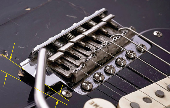 Photos from around 2006-2014 (shown above) and in the Black Strat book show the bridge plate still rests fairly close to the body, with the back raised about 1.5mm. The bridge on his red EMG Strat was set up the same way. Gilmour stated in the January 2009 issue of Guitar Player that his current strat bridge has three springs. If you watch him playing in the 2006 Remember That Night DVD, he does not seem to use the trem as much as he did in the '80s and '90s, but when he does it appears to be fairly tight, so he was probably still using four springs when playing live, as he had been doing since the late 1970s. HOW TO SET UP A FLOATING BRIDGE - I keep the 2-point screws that the bridge pivots on set very low, so the front of the bridge is flush with the guitar body. If your strat is a six point (six screws), you may want to raise the four inner screws slightly higher thatn the outer screws for a floating bridge. Most people will want to have the back of the bridge plate no more than 3mm (1/8“) off the guitar body for a floating bridge. I like mine high, around 5-6mm (1/4”). I tighten the two 2" screws that hold the spring claw deep into the wood body to tighten the springs. It is a balancing act between the string tension and the spring tension. I jack the string height up with the saddle screws to compensate for having only a few springs, and also because I like the strings set high above the fret board. Doing this I can get the saddles back parallel with the guitar body and stay in tune. When I set the strings up high, Fender saddle screws sometimes go crooked because the screw threading is not done very well. Callahams screws are slightly better. I have talked to many people who have serious problems with staying in tune when using a floating bridge like this. I am baffled by this as I have never encountered that problem, and rarely have to tune my Strats. The only string I find sometimes goes out of tune when doing deep bends is the G string. The beauty of the floating bridge is that you only have to pull up on the tremolo bar slightly and the G goes back into tune. I believe any tuning problems are probably more associated with nut binding, bad saddles that bind or snag strings because of poor surface finishing, bad or incorrect string wrapping around the tuning pegs, or simply not stretching the strings properly after restringing the guitar. HOW TO SET UP A NON-FLOATING BRIDGE - In theory, you will get more sustain if the bridge plate is flat and resting on the body, due to the increased resonance of the strings vibrating through the guitar body because of the solid contact. That can also make the sound thin or tinny on some Strats. I say “in theory” because I get plenty of sustain and my bridge plates have always been floating quite high off the body. If you do not want the trem plate to float, there are two common ways to set up a non-floating trem - completely flat on the body, or slightly raised on the pivot end. I don't recommend having the whole plate flat. Strats sound better to me if they are raised a bit on the pivot end. I think that is what makes a Strat sound stratty, but it varies from Strat to Strat. Most people use 3-5 springs for a non floating bridge. I would not use less than 3. Loosen the strings about 1 1/2 turns. Tighten the two spring claw screws in the spring cavity on the back of the guitar until the trem plate on front is flush with the guitar body. Then tune up again. If the trem plate pulls up as the string tension increases, you can tighten the claw screws more, or even add another trem spring if you only have three. After you get that balance worked out and the back of the trem is flush or touching the guitar body, bend the high E up to the low E string at the 12 fret. The plate should not lift, or barely lift. If it still lifts when bending strings, repeat the above steps until you get it relatively non floating. Look at the the screws the bridge trem plate pivots on. If the screw pivot end of the plate is floating off the wood a bit, you can turn the screws in more to get the entire plate resting flat on the guitar, or not. I would keep it at least 0.2-0.5mm off the body on the pivot end, though the other end of the plate can be touching the body. To adjust the pivot screws, raise all the middle screws a few mm so the are not contacting the plate. Use the two outer screws to raise or lower the plate, turning the same on each so the plate is not higher on one side than the other. Then turn all the middle screws so they are the same height as the outer. Try it completely flat, or up a bit on the pivot side and see which you prefer. Keep in mind, if you adjust the pivot screw height, you will change the string height, and likely change the guitars intonation. You will need to adjust the two saddle height screws on each saddle, and recheck the guitar intonation. Recheck the intonation anyway, even if you do not adjust the pivot screw height. TIP - If you have a flush mounted, non floating tremolo bridge, and you find your guitar tone sounds a bit thin or tinny, try raising the pivot screws just a hair or two. Actual contact of the bridge plate to the guitar body can thin out the tone on some strats. The guitar does not really need the bridge plate to have contact with the body for the strings vibrations to resonate through it. The close proximity of the bridge to the body, and the fixed contact of the pivot screws handle that job just fine, and I believe that is what makes a Strat sound like a Strat. Keep in mind the string height will be raised when you raise the bridge, so adjust the two saddle height screws on each saddle. Recheck the guitar intonation and adjust if needed. TIP - Have you noticed the tremolo springs can become creaky and noisy, to such a degree that you can hear it through your amp? The creaking, poppy pings may sound like they are coming from the tremolo springs, but this is likely the strings sticking in the nut slot at the en