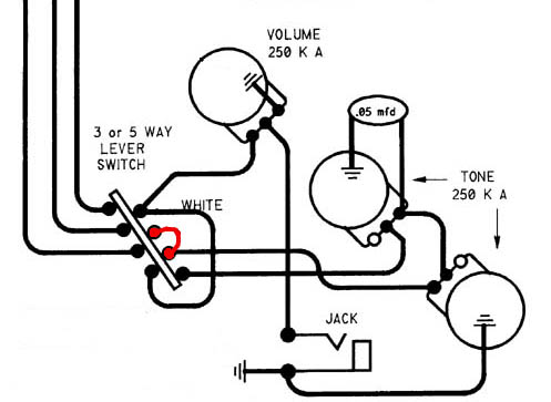 TONE CONTROLS - The Black Strat tone controls were originally wired the traditional way with the upper tone control wired to the neck pickup and the lower one wired to the middle pickup. At some point in 1979 or earlier David added a jumper wire to the pickup selector that made the middle tone pot function for both the middle and bridge pickups. The mod was removed at some point, and it does not appear on the Fender Signature series replicas. I have used Strats with the bridge wired to the tone pot, but never used it, so I did not make this mod on my Black Strat. If you want the bridge tone control, simply add a jumper wire between the two pickup selector lugs shown in red in the drawing below.